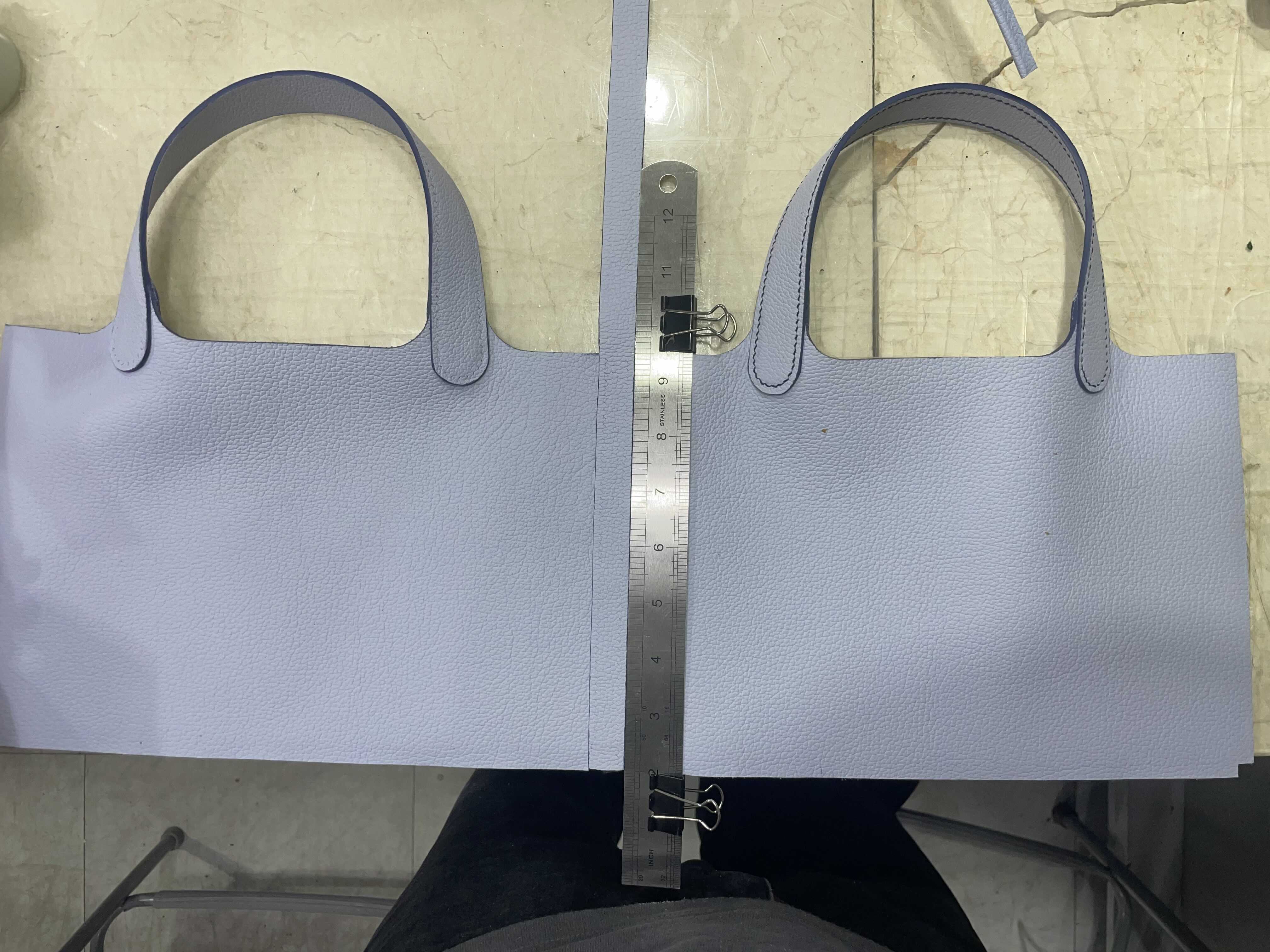 몸판 핸들달릴 곳 패턴 절개 후 은펜으로 표시. 스크래치 후 본딩